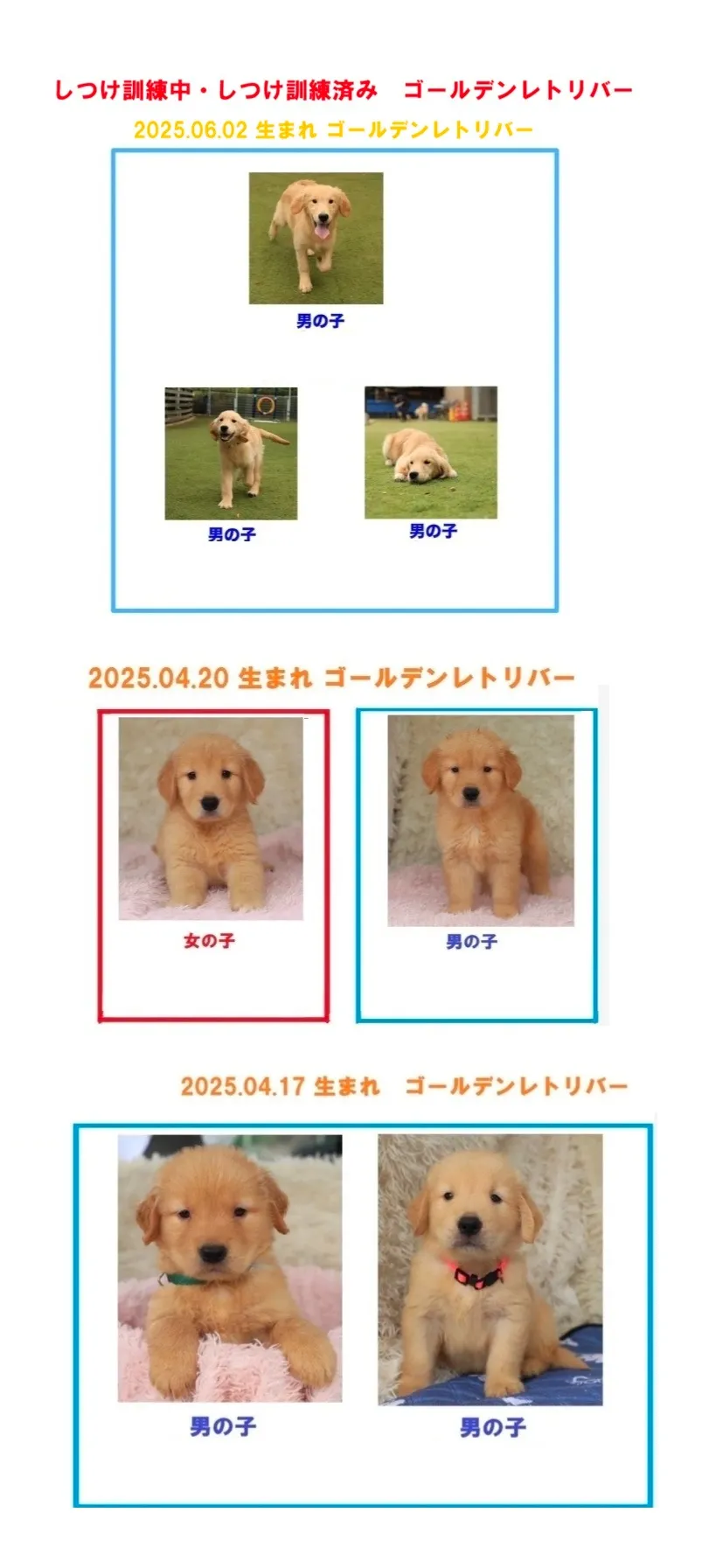 ☆ 気になる子がおりましたらお問い合わせは歓迎ですが、 命ある子犬たちを販売するにあたり、当スクールも大切に育て上げた子犬たちですので、厳しい制約を御容赦いただきご理解いただけましたら幸いです。